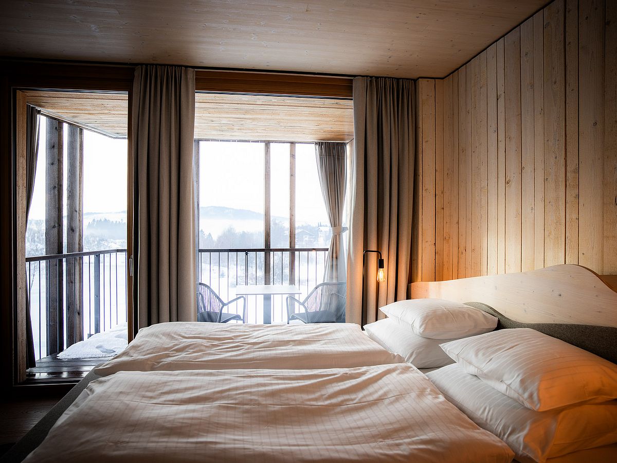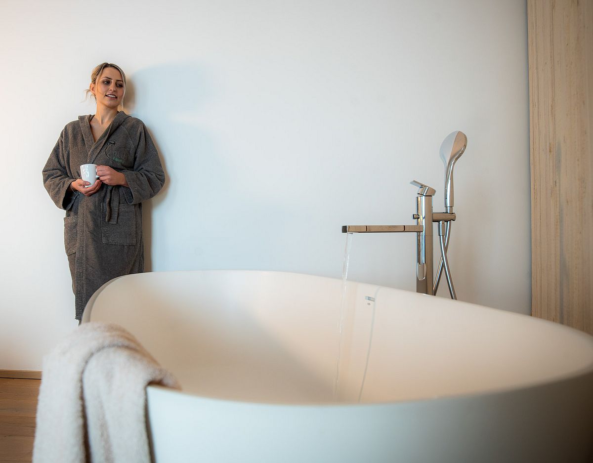 A box seat by the lake: our 70 m² panorama suite at the Naturhotel offers plenty of space for wellness lovers. A private Finnish sauna and freestanding bathtub in the bedroom are a highlight for anyone who wants to combine privacy with wellness moments.