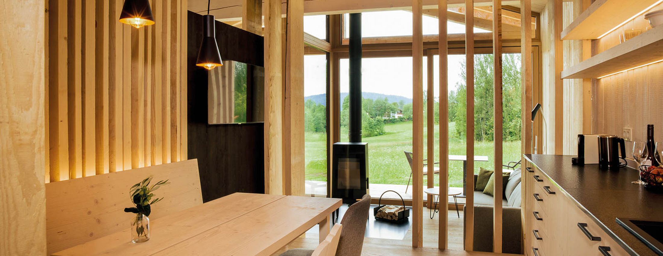 Offene Glasfronten öffnen den Blick auf die Landschaft und den stillen Weiher. Es ist dieser Mix aus Ruhe und Geborgenheit, der mich hier besonders anspricht. Wie auch die anderen Woidhaisln verfügt „602“ über eine große Terrasse samt Liegen und eigenem Badefassl.