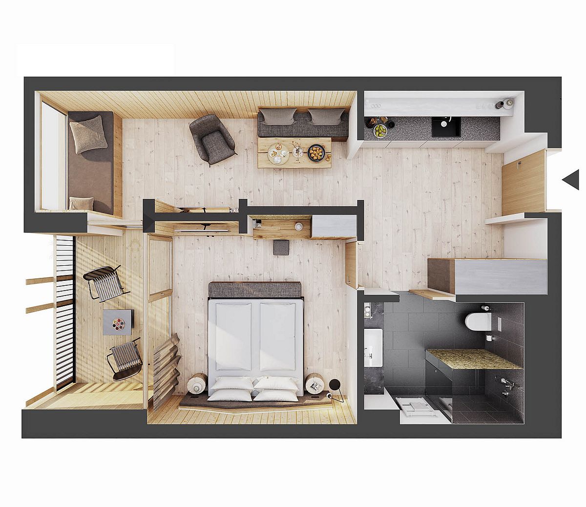Modernes Design, viel Holz und das große Panoramafenster sorgen für ein herrliches Wohngefühl. Ausgestattet ist diese Juniorsuite mit King-Size-Bett, ausziehbarer Couch, Essecke und Teeküche (ohne Herd) mit Teestation. Die Erstbefüllung der Minibar ist inklusive.