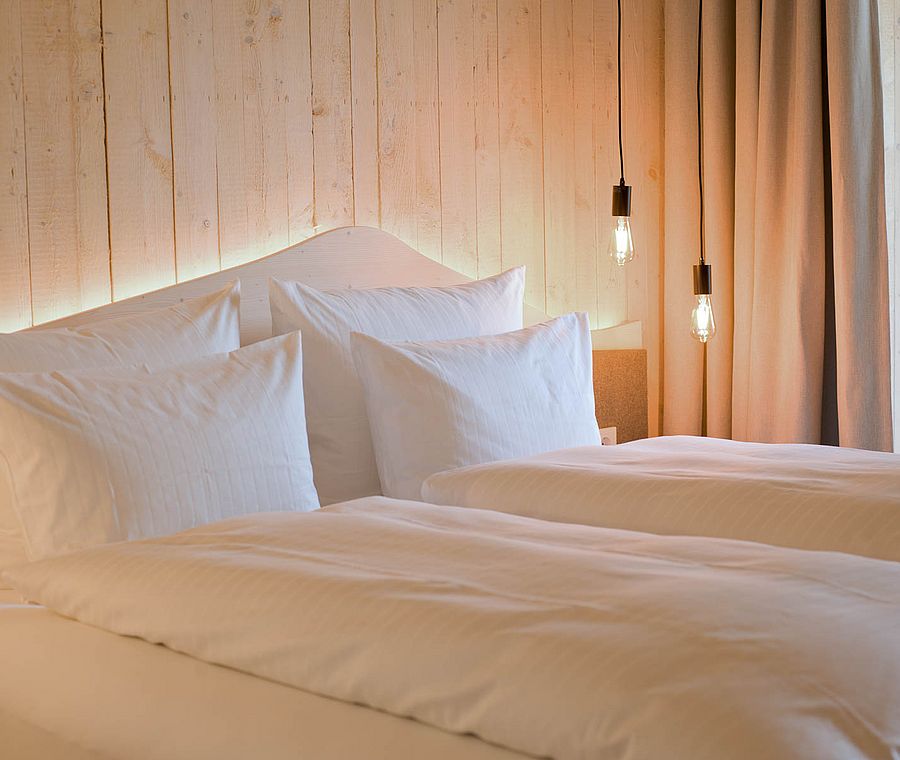 Aufwachen, von der Sonne geküsst: Unsere Juniorsuite Morgensonne im Naturhotel verwöhnt Sie mit den ersten warmen Sonnenstrahlen des Tages und herrlichem Blick in die Natur.