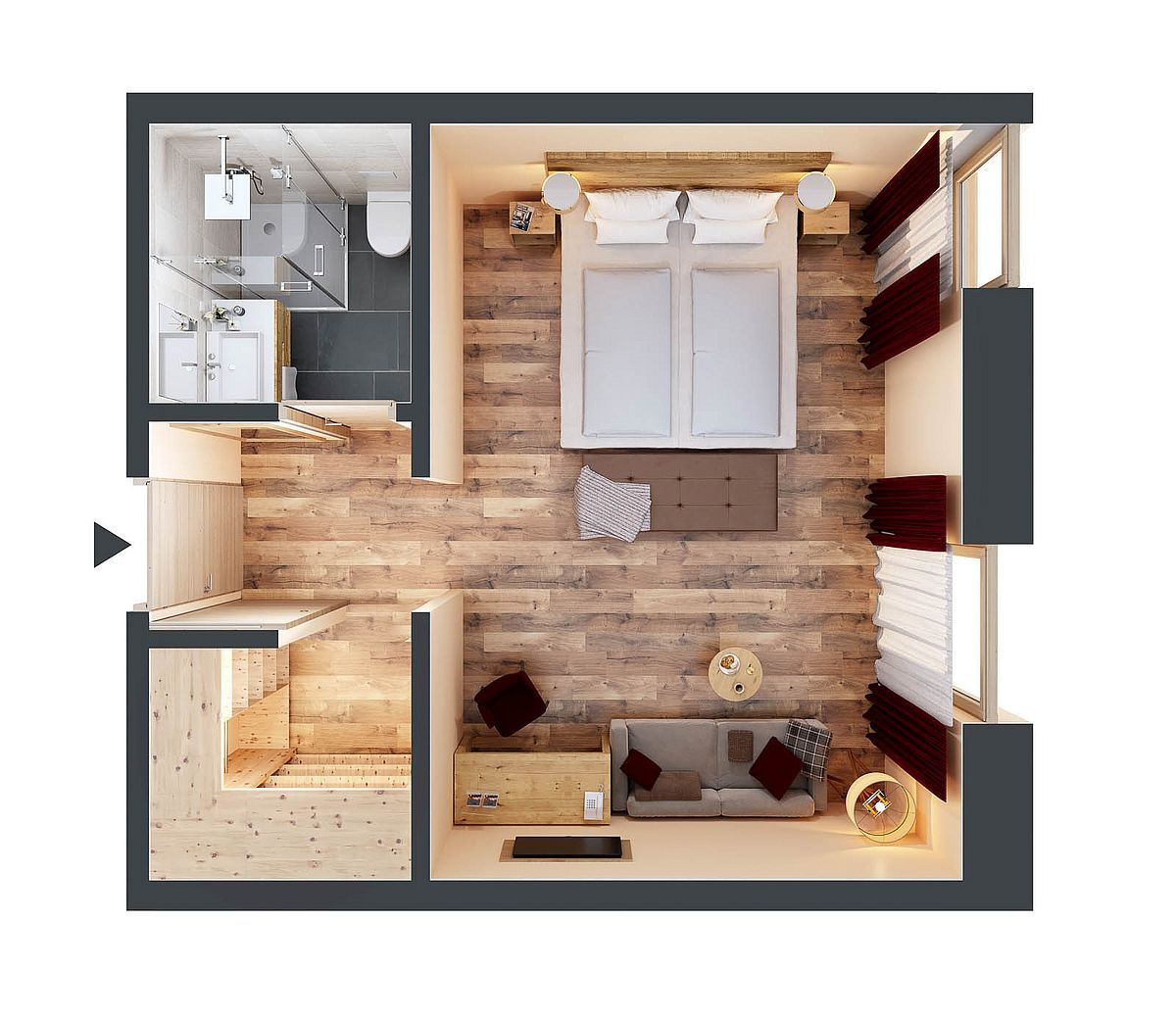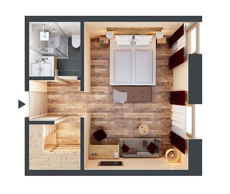Die eigene Terrasse lädt zum Sonnenbaden in ruhiger Lage ein. Neben Doppelbett, Couch und Schreibtisch erwarten Sie ein modernes Bad mit Dusche, Teestation, Minibar und ein Safe.